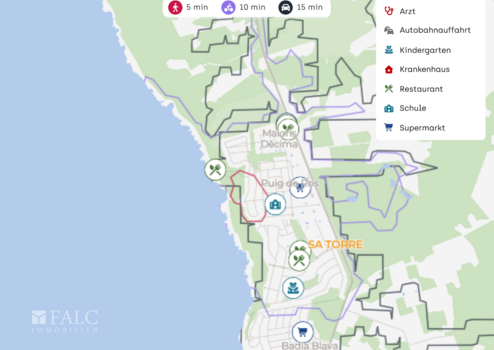 Explizit in der Umgebung genannt und besonders relevant sind der Supermarkt Mercadona, die Schule Escola Urbanitzacions, der Golfplatz Maioris sowie das Restaurant Mhares.