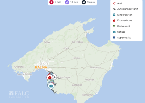Zum internationalen Flughafen sind es ca. 20 und in die Innenstadt von Palma 30 Autominuten.