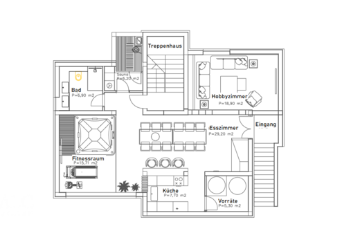Im Souterrain eröffnet sich ein vielseitiger Wellness- und Freizeitbereich mit Sauna, Fitnessraum und Hobbyzimmer. Ergänzt wird diese Ebene durch ein Badezimmer sowie ein großzügiges Wohn- und Esszimmer mit offener Küche und praktischem Vorratsraum – ideal für entspannte Stunden oder gesellige Abende in privater Atmosphäre.