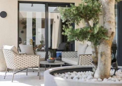 Das Obergeschoss beherbergt drei komfortable Schlafzimmer, jeweils mit eigenem Bad. Alle Schlafzimmer verfügen über Zugang zu einer teilweise überdachten Terrasse, die den Wohnraum ins Freie erweitert und zusätzliche Privatsphäre bietet.
