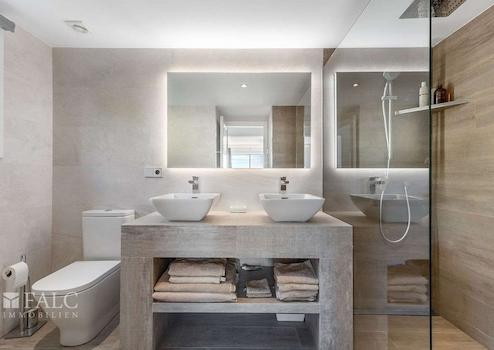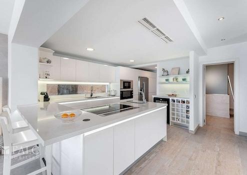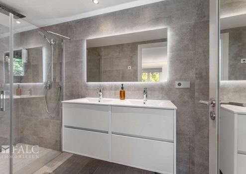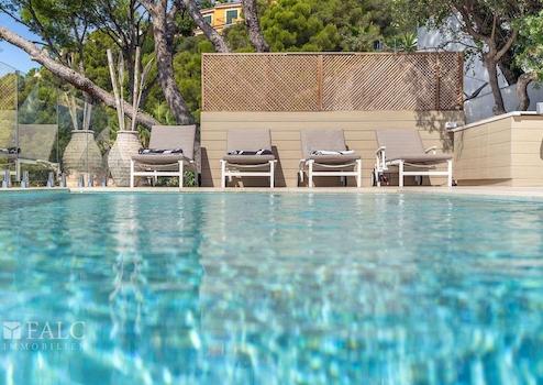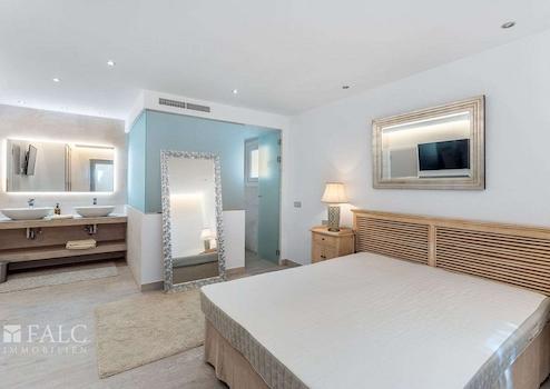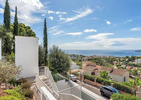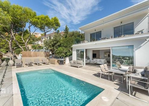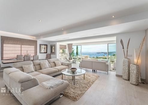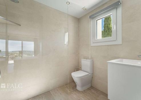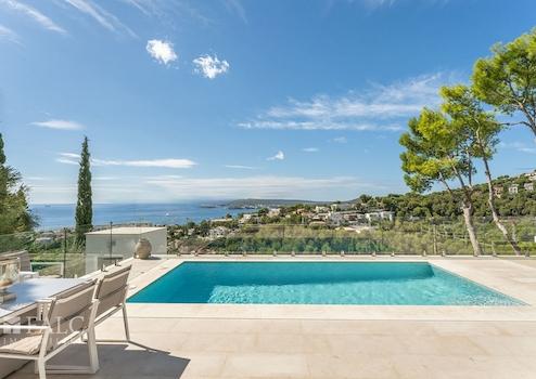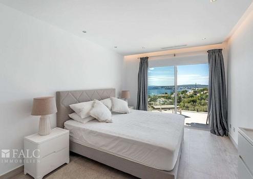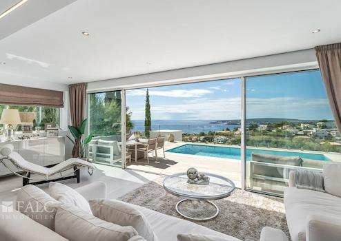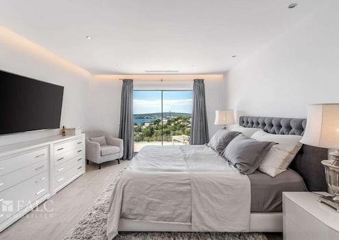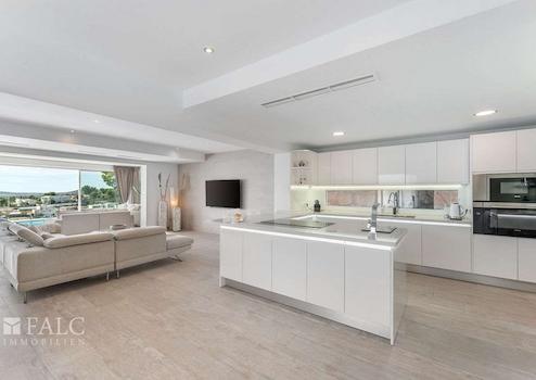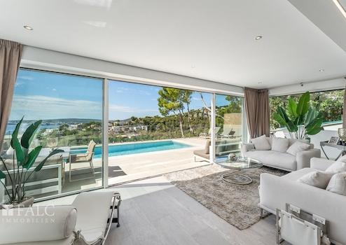 In einer der exklusivsten Straßen des Südwestens Mallorcas gelegen, präsentieren wir diese luxuriös renovierte Villa in Costa d'en Blanes. Die noble Immobilie bietet einen unvergleichlichen Meerblick, höchsten Qualitätsstandard und eine elegante Inneneinrichtung. Die nach Südosten ausgerichtete Villa befindet sich auf einem ca. 1.301 m2 Grundstück und bietet eine grosszügige bebaute Fläche von ca. 383 m2 (ungefähr 253 m2 Wohnfläche), die sich wie folgt auf 2 Etagen verteilt: Ein beeindruckender und mit einem Fahrstuhl ausgestatteter Eingangsbereich, der zur Garage und zur Treppe führt, ein offener und lichtdurchfluteter Wohn-/Essbereich mit raumhohen Fenstern und Zugang auf die atemberaubende nach Südwesten ausgerichtete Poolterrasse mit Sommerküche und einzigartiger Aussicht auf das malerische Mittelmeer, eine voll ausgestattete Küche mit hochwertigen Haushalsgeräten und angrenzender eine Waschküche, 4 wunderschöne Schlafzimmer mit Einbauschränken, sowie 4 Badezimmer, 3 davon en-suite. Diese Villa bietet reichlich Platz zum Entspannen und ein aussergewöhnliches Wohngefühl. Zu den Extras gehören: Komplett möbliert, dreifach verglaste Fenster, hochwertige Naturstein - und Holzböden, Ankleidezimmer, Fussbodenheizung, Klimaanlage mit Heizpumpe und vieles mehr. Eine komfortable Garage für 2 Pkws vervollständigt dieses tolle Immobilienangebot. Costa d'en Blanes ist ein exklusives Villengebiet oberhalb des geschätzten Yachthafens von Puerto Portals. Mehrere internationale Privatschulen und bekannte Golfplätze befinden sich ebenfalls in der Nähe.
