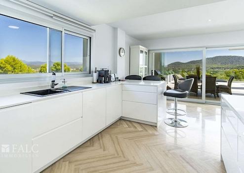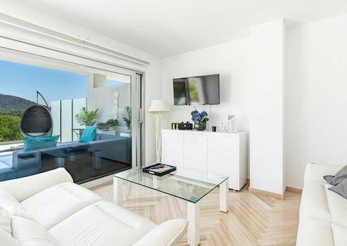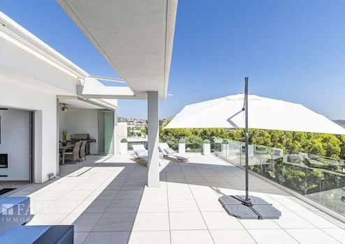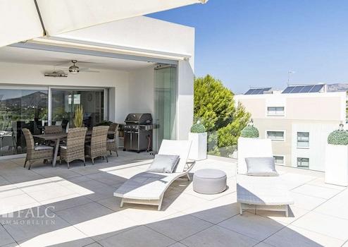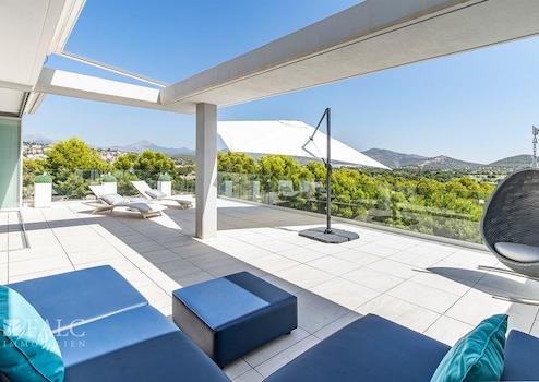 Dieses fabelhafte Penthaus in Santa Ponsa bietet einen herrlichen Ausblick auf die Berge und liegt in einer privilegierten Wohngegend in der Nähe des Golfplatzes und des Strandes, im Südwesten der hübschen Insel Mallorca. Die tolle Immobilie verfügt über eine bebaute Fläche von ca. 183 m2, die wie folgt aufgeteilt sind: ein elegantes Wohn-/ Esszimmer mit Zugang zu einer grossen, spektakulären Terrasse mit Chill-Out-Bereich und herrlichem Bergblick, eine amerikanische Küche, 2 geräumige Schlafzimmer, sowie 2 Badezimmer. Die gepflegte Anlage bietet den Eigentümern einen fantastischen Gemeinschaftspool und schöne Gartenbereiche, um das zauberhafte, mediterrane Ambiente der wunderschönen Insel Mallorca zu geniessen. Zu den Ausstattungsmerkmalen dieses tollen Penthauses in Santa Ponsa zählen: Klimaanlage, Fussbodenheizung, doppelt verglaste Fenster und Keramikböden. Zur Verfügung stehen 2 im Preis inbegriffene Parkplätze. Es handelt sich um eine sehr attraktive Lage, in der Nähe des Golfplatzes, des schönen Strandes mit türkisfarbenem Wasser und fussläufig zu allen Dienstleistungen, die man im täglichen Leben braucht. Der exklusive Yachthafen Port Adriano liegt nur wenige Autominuten entfernt.