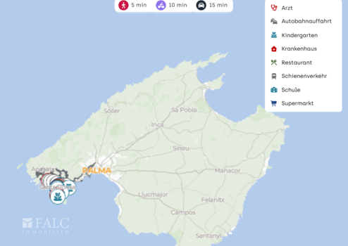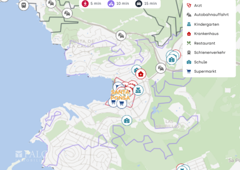 Die nächste Autobahnauffahrt ist in wenigen Minuten erreichbar, je nach Route in etwa ca. 3 bis 4 km Entfernung. Damit sind Ziele in der Region Calvià und darüber hinaus unkompliziert erreichbar. Der Flughafen Palma de Mallorca ist mit dem Auto in etwa ca. 30 Minuten erreichbar. Auch Palma ist gut angebunden und liegt je nach Verkehr in etwa ca. 20 bis 30 Minuten Fahrzeit entfernt. Für den öffentlichen Nahverkehr stehen Busverbindungen in Santa Ponça zur Verfügung, sodass Sie auch ohne Auto flexibel bleiben können.