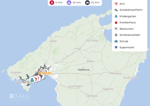 Die Anbindung ist ein klarer Pluspunkt: Mehrere Autobahnauffahrten liegen in ca. 1 bis 1,5 km Entfernung und verbinden Sie zügig mit Palma sowie weiteren Zielen auf der Insel. Der nächste ÖPNV Anschluss ist in der Regel entlang der Hauptachsen von Illetes gut erreichbar. Der Flughafen Palma de Mallorca ist je nach Verkehr in ca. 20 bis 30 Minuten mit dem Auto erreichbar.