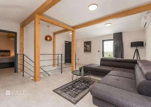 Im Erdgeschoss befindet sich ein offen gestalteter Wohnbereich mit Wohnzimmer, moderner Küche und Essbereich. Große Fensterflächen schaffen eine helle, freundliche Atmosphäre und ermöglichen einen direkten Zugang zur Terrasse sowie in den gepflegten Garten. Ein besonderes Highlight auf dieser Ebene ist das private Fitnessstudio, das ebenfalls direkten Zugang in den Außenbereich bietet. Zu den besonderen Highlights zählt der Swimmingpool mit Sonnenbereich, der zu erholsamen Stunden unter der kroatischen Sonne einlädt. Natürlichen Schatten spendet eine jahrhundertealte Eiche, die dem Außenbereich einen einzigartigen, mediterranen Charakter verleiht.