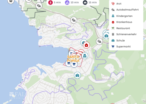 Für den täglichen Einkauf sind mehrere Supermärkte in der Nähe, darunter Suma und Spar, jeweils in ca. 1,5 km Entfernung. Ergänzend stehen Drogerieangebote wie Müller in ca. 2,5 km zur Verfügung. Auch medizinisch ist die Lage gut aufgestellt: Das Centre de salut de Santa Ponça erreichen Sie in ca. 2,5 km, weitere Arztpraxen liegen ebenfalls in diesem Umkreis.