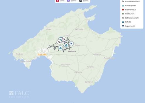Eine Lage, die Ruhe und mallorquinisches Landleben mit einer alltagstauglichen Infrastruktur verbindet. Kurze Wege zu Einkauf, Gastronomie und Sport sowie die schnelle Anbindung an Autobahn und Flughafen machen den Standort besonders attraktiv.