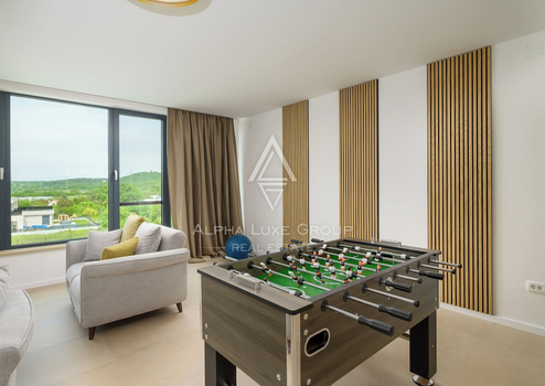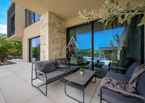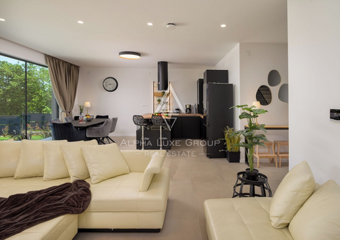 Diese moderne Villa zum Verkauf in der Nähe von Rovinj bietet eine anspruchsvolle Kombination aus modernem Design, Komfort und absoluter Privatsphäre. In einem ruhigen Dorf gelegen und von einem wunderschön angelegten Garten von 550 m² umgeben, verfügt die Immobilie über 216 m² Wohnfläche, verteilt auf zwei Ebenen. Im Erdgeschoss befinden sich ein großzügiger Eingangsbereich, ein Gäste WC und ein heller offener Wohnbereich, der nahtlos in die elegante Veneta Cucine Küche und den Essbereich übergeht. Große Glasfronten erstrecken sich über die gesamte Hauptfassade, lassen viel Tageslicht herein und bieten einen ungehinderten Blick auf den Garten. Auf dieser Etage befindet sich außerdem das Hauptschlafzimmer mit eigenem Bad und direktem Zugang zum Garten sowie ein praktischer Abstellraum mit Außenzugang.