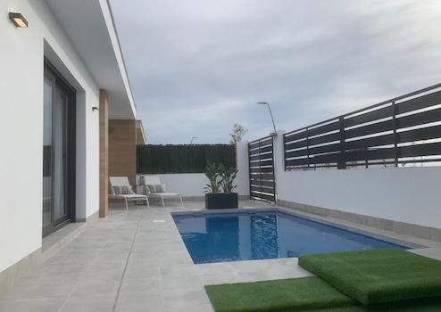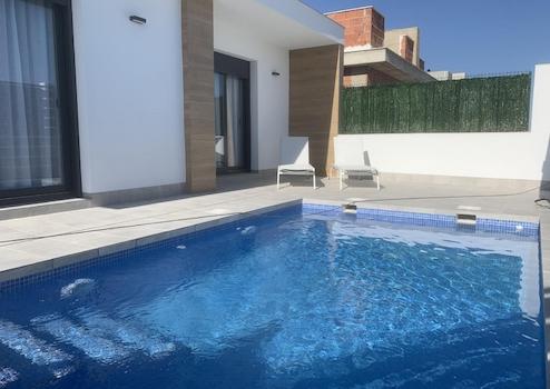 Diese modernen, freistehenden Villen in Roldán, Costa Cálida, vereinen zeitgemäßes Design, Luxus und höchsten Wohnkomfort. Jede Villa verfügt über drei großzügige Schlafzimmer, drei elegante Badezimmer und hochwertige Einbauschränke, die für Ordnung und Stil sorgen. Der private Swimmingpool auf dem eigenen Grundstück lädt zu entspannten Stunden im Freien ein, während ein eigener Parkplatz praktischen Komfort bietet. Käufer können zwischen einer ebenerdigen Villa und einer zweistöckigen Variante wählen, je nach individuellen Bedürfnissen und Vorlieben.