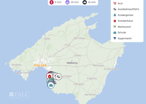 Die Verkehrsanbindung ist praktisch: Bushaltestellen liegen in der Nähe, sodass auch ohne Auto eine gute Grundmobilität gegeben ist. Mit dem Auto sind Autobahnauffahrten in ca. 5 km erreichbar. Der Flughafen Palma de Mallorca liegt je nach Verkehr in etwa 15 km Entfernung und ist damit für An und Abreise sowie Wochenendtrips komfortabel angebunden.