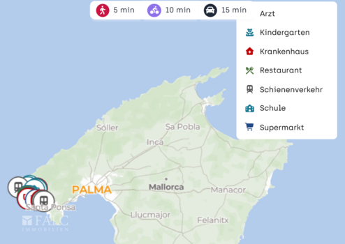 Mit dem Auto erreichen Sie die Auffahrten zur Ma 1 in etwa 10 Minuten, was eine zügige Verbindung Richtung Palma ermöglicht. Der Flughafen Palma de Mallorca ist je nach Verkehr in ca. 35 bis 45 Minuten erreichbar.