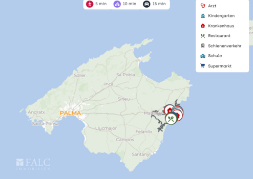 Mehrere Bushaltestellen wie Hospital Portocristo und Mestral liegen in der Nähe und sorgen für eine praktische Anbindung im Ort und Richtung Umgebung. Der nächste Bahnanschluss befindet sich in Manacor und ist mit dem Auto in etwa 15 Minuten erreichbar. Der Flughafen Palma de Mallorca ist je nach Verkehr in rund 50 bis 60 Minuten mit dem Auto erreichbar. Die überregionalen Straßenverbindungen Richtung Inselzentrum sind zügig erreichbar, der Anschluss an die Schnellstraße bei Manacor liegt ungefähr 15 bis 20 Minuten entfernt.