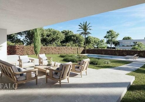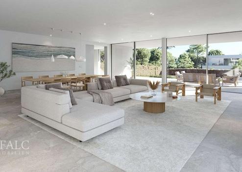 Diese moderne Neubauvilla in Sol de Mallorca ist eine von 6 neuen Villen, die in der privilegierten Wohngegend, nur wenige Gehminuten vom Strand mit türkisfarbenem Wasser entfernt, im Südwesten der wunderschönen Insel Mallorca gebaut werden. Jede Villa wird ihr eigenes Design haben und sich durch hohe Decken, grosse bodentiefe Fenster, sowie eine grosszügige Raumaufteilung auszeichnen. Die luxuriöse Immobilie wird eine bebaute Fläche von ca. 753 m2 haben, die wie folgt auf 2 Etagen verteilt werden: Das Erdgeschoss wird ein geräumiges Wohn-/ Esszimmer mit Zugang zur Terrasse mit Pool, eine Küche mit Kochinsel und Gaggenau-Geräten, 1 Doppelzimmer mit en-suite Badezimmern und Ankleideraum, sowie ein Gäste-WC bieten. Auf der ersten Etage werden sich 4 Doppelschlafzimmer mit en-suite Badezimmern und Einbauschränken (das Hauptschlafzimmer mit Ankleide) befinden. Alle Schlafzimmer werden Zugang zu einer Terrasse oder einem Balkon haben. Zu den Ausstattungsmerkmalen dieser luxuriösen Villa in Sol de Mallorca werden zählen: Klimaanlage, Fussbodenheizung, Sonnenkollektoren, Alarmanlage und Steinböden. Es werden 2 Carports und 2 Stellplätze zur Verfügung stehen. Es handelt sich um eine attraktive Lage in der Nähe der Strände und nur wenige Autominuten vom nächsten Golfplatz entfernt.