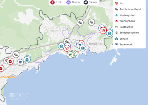 Die nächste Bushaltestelle, zum Beispiel Marineland 1 oder Plaça de Portals 1, ist in etwa fußläufiger Entfernung erreichbar und sorgt für eine gute Anbindung in die umliegenden Orte. Die Autobahnauffahrt zur Ma 1 Richtung Palma und Andratx liegt nur wenige Minuten entfernt, wodurch Sie Palma bequem erreichen.