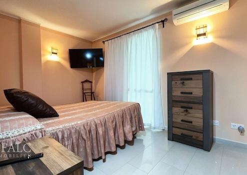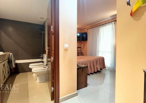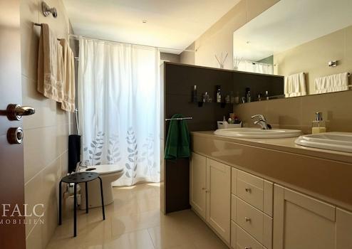 Das großzügige Hauptschlafzimmer überzeugt nicht nur durch seine Ruhe und Weitläufigkeit, sondern auch durch den direkten Zugang zur Terrasse. Ein komfortables Ensuite-Badezimmer mit Badewanne, Dusche, Bidet und WC rundet diesen privaten Rückzugsort ab.
