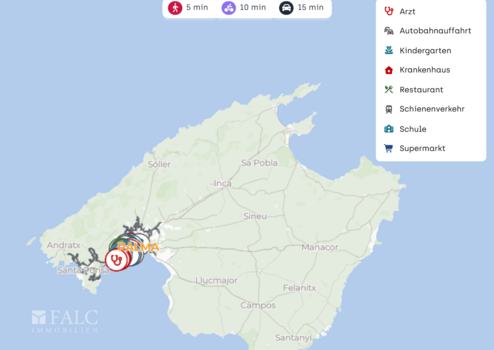Die nächste Bushaltestelle ist fußläufig erreichbar, zum Beispiel Camí dels Reis, 12. Mit dem Auto ist die Autobahnauffahrt in der Nähe, was die Wege in Richtung Palma und über die Insel erleichtert. Der Flughafen Palma de Mallorca ist mit dem Auto in etwa 15 Minuten erreichbar. Für weiterführende Verbindungen liegen größere Verkehrsknotenpunkte in Palma in kurzer Fahrdistanz.