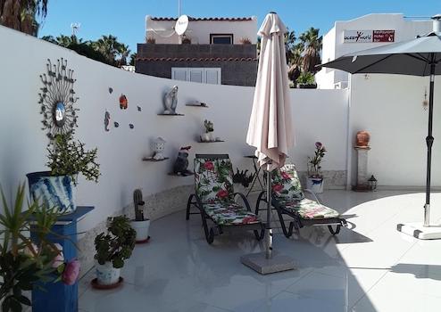 Große Terrasse (teilweise überdacht) mit Liegen, Sonnenschirme, Esstisch, Sessel, ausserdem gibt es eine grosse Terrasse auf dem Dach mit eingeschränktem Meerblick. Insgesamt ca. 65 m2 Terrassen