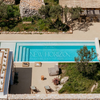Centennial olive trees, a lawn, and planted vegetables and fruit adorn the house's façade. The outdoor kitchen is equipped with a barbecue, a pizza oven, a refrigerator, an ice maker, and a dishwasher.