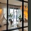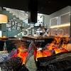 Im Erdgeschoss befindet sich eine elegante Lobby, die in den offenen Wohnbereich führt. Dieser vereint eine moderne Küche mit Kochinsel, ein großzügiges Esszimmer und ein noch geräumigeres Wohnzimmer. Ein moderner Elektrokamin, der als zentraler Blickfang dient und Wohnzimmer, Küche und Esszimmer optisch voneinander trennt, trägt zusätzlich zur besonderen Atmosphäre während Ihres Aufenthalts bei. Der Kamin dient weniger der Beheizung als vielmehr der Atmosphäre.
