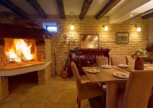 - living room with a fireplace and large dining table (possible to arrange a billiards table)