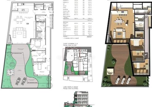Apartment 3 befindet sich im Untergeschoss (-1) des Gebäudes und verfügt über eine elegante Eingangshalle, die den Wohn- vom Schlafbereich dieses hochwertigen Luxusapartments trennt und so für außergewöhnliche Privatsphäre sorgt. Der großzügige und helle Wohnbereich mit Küche, Speisekammer und Essbereich grenzt an eine charmante Terrasse mit atemberaubendem Ausblick. Die teilweise überdachte Terrasse ist mit einer Grünfläche verbunden, die für eine entspannende Atmosphäre sorgt und die Möglichkeit bietet, Annehmlichkeiten wie Whirlpool, Sauna und Sommerküche für maximalen Luxus und ein außergewöhnliches Wohnerlebnis zu installieren. Im Apartment befinden sich drei weitere Schlafzimmer, jeweils mit eigenem Zugang zur Terrasse. Das Hauptschlafzimmer verfügt über ein Ankleidezimmer und ein Badezimmer mit Hydromassage-Badewanne, das zum Entspannen und Genießen einlädt. Zusätzlich gibt es einen Technikraum, ein weiteres Badezimmer zur Mitbenutzung und ein Gäste-WC.