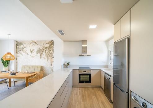 Diese modernen Apartments mit drei Schlafzimmern und zwei Badezimmern bieten ein entspanntes Wohnambiente, das Komfort und mediterrane Lebensfreude harmonisch verbindet. Die Erdgeschosswohnungen verfügen über einen privaten Garten, während die Duplex-Apartments mit großzügigen Sonnenterrassen begeistern - perfekte Orte, um das ganzjährig milde Klima zu genießen. Einbauschränke sorgen für praktischen Stauraum und unterstreichen das durchdachte Wohnkonzept. Zu jeder Wohnung gehört ein privater Stellplatz innerhalb der Anlage, der zusätzlichen Komfort im Alltag bietet.