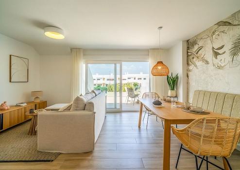 Diese attraktiven Apartments mit zwei Schlafzimmern und zwei Badezimmern bieten ein harmonisches Wohnambiente, das Komfort, Funktionalität und mediterranes Lebensgefühl perfekt vereint. Die Erdgeschosswohnungen verfügen über einen privaten Garten, während die Duplex-Apartments mit großzügiger Sonnenterrasse begeistern - ideale Orte, um die Sonne Spaniens zu genießen und entspannte Stunden im Freien zu verbringen. In jeder Wohnung sorgen praktische Einbauschränke für ausreichend Stauraum und tragen zu einem aufgeräumten, eleganten Wohngefühl bei. Ein privater Stellplatz innerhalb der Anlage rundet den Wohnkomfort zusätzlich ab.