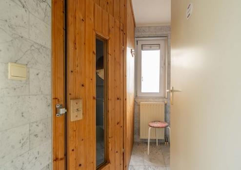 Das zweite Badezimmer ist ebenfalls mit Fliesen ausgestattet und konzentriert sich mit einer separaten Dusche mehr auf die praktische Bequemlichkeit. Auch dieser Raum verfügt über einen schlichten Waschtisch mit einem runden Spiegel und einer Ablage für Toilettenartikel. Durch das Vorhandensein sowohl einer Badewanne als auch einer Dusche in der Wohnung ist für jeden etwas dabei und das Haus ist hervorragend für einen Aufenthalt mit mehreren Personen ausgestattet.