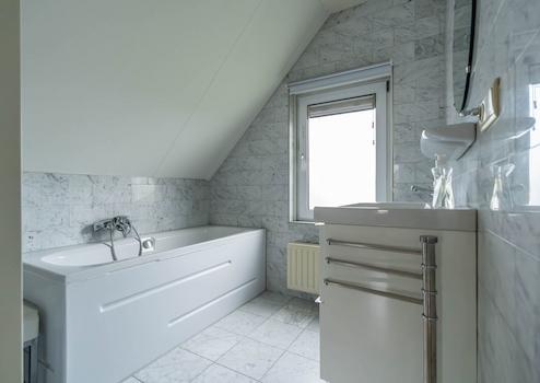 Das erste Badezimmer ist komplett ausgestattet und bietet den Luxus einer geräumigen Badewanne, ideal zum Entspannen nach einem aktiven Urlaubstag. In diesem Raum befinden sich auch ein weißer Waschtisch mit Schubladen und ein Heizkörper, während ein Fenster für angenehmes Tageslicht und Belüftung sorgt.