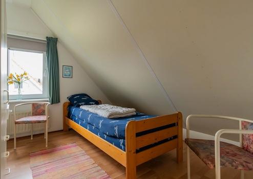 Dieses Zimmer befindet sich ebenfalls im ersten Stock und ist mit einem bequemen Einzelbett ausgestattet. Trotz der schrägen Dachlinie wirkt das Zimmer hell und geräumig.
