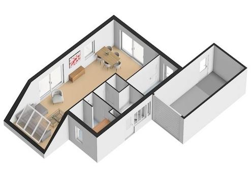 Helles Wohnzimmer dank des hohen Schrägfensters (mit Rollladen) und zwei Schiebetüren, die Zugang zur doppelten Terrasse (West- und Nordseite) bieten.