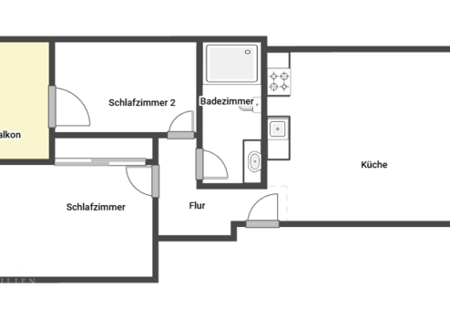 - 3 Zimmer aufgeteilt in Wohnzimmer und 2 Schlafzimmer