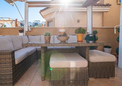 Draußen erwartet Sie ein traumhafter, 188 m² großer privater Außenbereich , ideal zum Entspannen, Essen und Genießen des mediterranen Lebensstils. Markisen und Sonnensegel sorgen jederzeit für Schatten und Komfort.