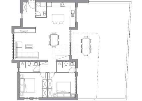 Die Wohnung besteht aus einer Eingangshalle, einer Speisekammer, zwei Bädern, zwei Schlafzimmern und einem offenen Wohnzimmer, einer Küche und einem Esszimmer, das durch große Glaswände in einen eingezäunten Garten führt.
