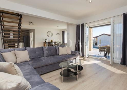 Ein neues Haus mit Swimmingpool und wunderschönem Panoramablick, gelegen in einer kleinen Siedlung, nur 3 Kilometer von der Stadt Labin entfernt.