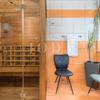 In der Mitte des Hofes befindet sich ein Swimmingpool mit Liegewiese und Whirlpool.
