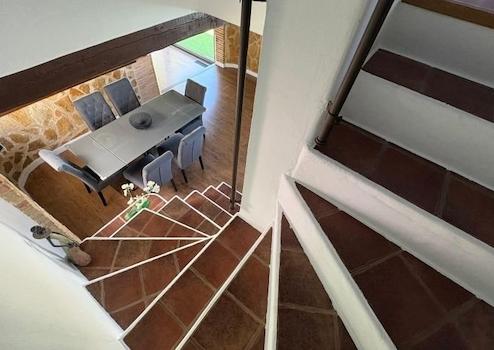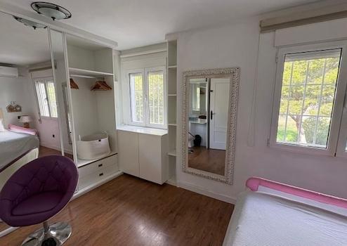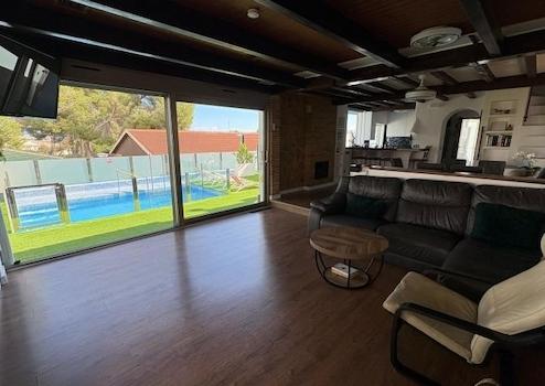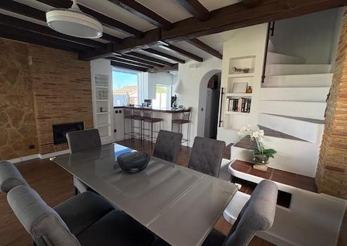 Im Erdgeschoss befindet sich ein geräumiges und helles Wohn-/Esszimmer mit großen Fenstern, die viel Tageslicht hereinlassen und direkten Zugang zum Außenbereich und zum privaten Pool bieten. Auf derselben Ebene befinden sich eine separate, voll ausgestattete Küche und eine Gästetoilette.