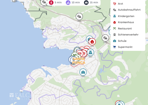 Im direkten Umfeld finden Sie alles für den täglichen Bedarf: Supermärkte wie Casa Pepe und Isla sind in der Nähe, ebenso eine Bäckerei wie das Baguette House für den schnellen Einkauf am Morgen. Für die medizinische Versorgung sind mehrere Arztpraxen sowie Apotheken fußläufig erreichbar, darunter die Clínica Santa Ponça und das Centre de salut de Santa Ponça.