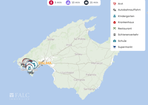 Die Anbindung ist komfortabel: Eine Bushaltestelle wie Platja (Santa Ponça) liegt in der Nähe und erleichtert Wege im Ort und Richtung Palma. Die nächste Autobahnauffahrt zur Ma 1 ist in wenigen Minuten erreichbar und verbindet Santa Ponça zügig mit Palma und weiteren Zielen der Insel. Der Flughafen Palma de Mallorca ist je nach Verkehr in etwa 30 Fahrminuten erreichbar.