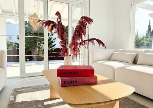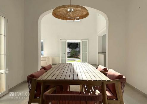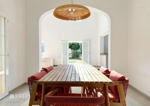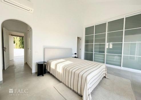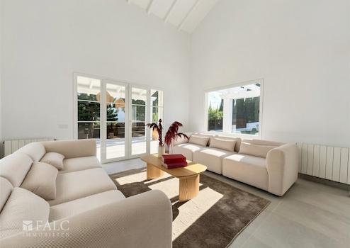 Herzstück des Hauses ist der offene Wohn- und Essbereich mit hohen Decken und direktem Zugang zu den Terrassen und dem Garten. Die elegante Küche mit Kochinsel fügt sich nahtlos in den Wohnraum ein und wird schnell zum Mittelpunkt des Familienlebens. Insgesamt stehen sechs geräumige Schlafzimmer mit Einbauschränken zur Verfügung, ergänzt durch vier modernisierte Badezimmer, davon drei en suite.