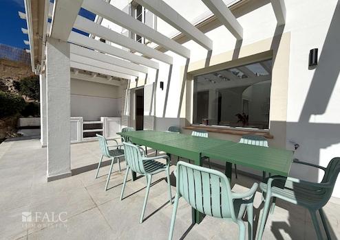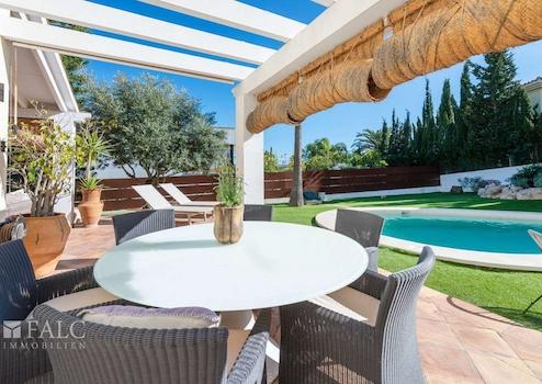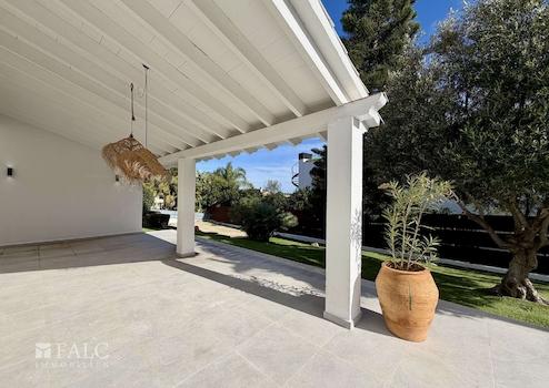 Der Außenbereich lädt mit großzügigen Terrassen, schattigen Rückzugsorten und einem pflegeleichten Salzwasserpool zu entspannten Stunden und geselligen Abenden ein - perfekt, um das mediterrane Lebensgefühl in vollen Zügen zu genießen.