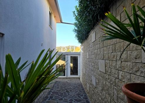 Der Garten ist umzäunt und mit mediterranen Pflanzen, Oliven- und Obstbäumen bepflanzt. Er verfügt außerdem über eine geschlossene Sommerküche.