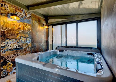 Zusätzlich zu den Schlafzimmern gibt es im ersten Stock eine Wellnessoase mit Whirlpool und Sauna.