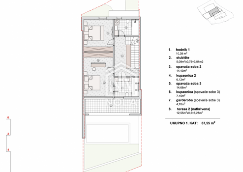 Die gesamte berechnete Fläche des ersten Stocks beträgt 67,55 m².