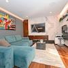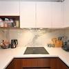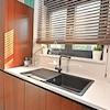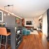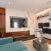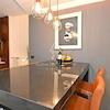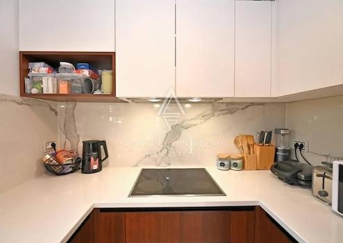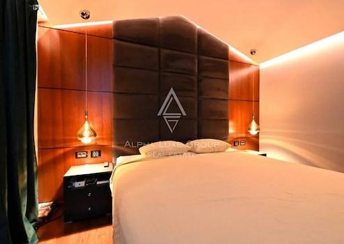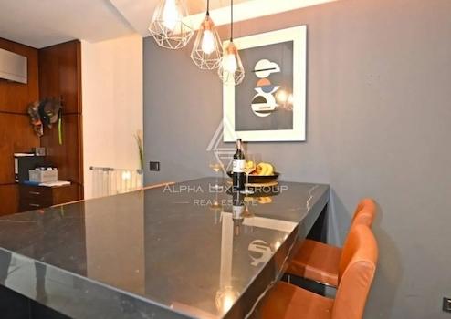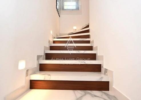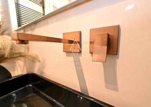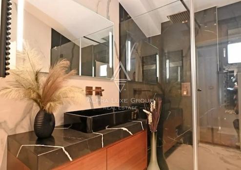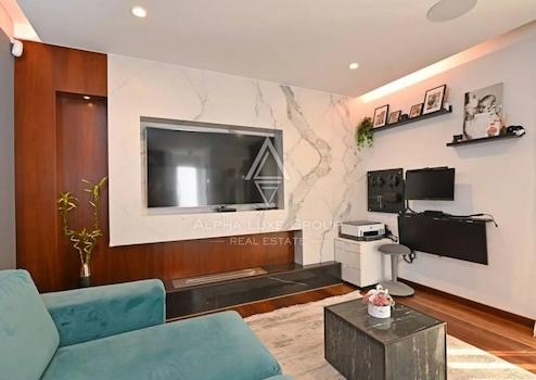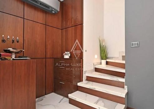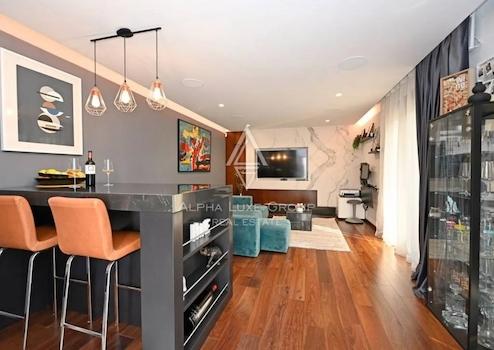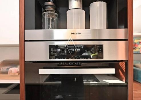 Im Innenraum dominieren hochwertige Materialien wie Keramik in Marmoroptik, Parkett in amerikanischem Nussbaumton und maßgefertigte Elemente aus Nussbaumfurnier. Küche und Bäder sind mit hochwertigen Geräten und Designer-Sanitärobjekten ausgestattet. Möbel und Geräte sind im Kaufpreis enthalten.