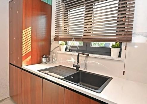 Die Energieeffizienz wird durch hochwertige Wärmedämmung und einen Energieausweis der Klasse B gewährleistet. Fußbodenheizung auf beiden Etagen wird über ein wassergeführtes System betrieben und von Daikin Altherma Wärmepumpen mit Wi-Fi-Steuerung unterstützt. Die Kühlung erfolgt über Daikin Klimageräte im Wohnbereich und in beiden Schlafzimmern. Ein Smart-Home-System steuert Beleuchtung, Heizung, Kühlung, Jalousien und Vorhänge sowie verschiedene Szenarien, auch per Smartphone.