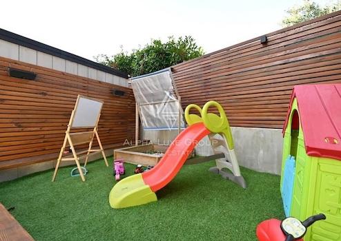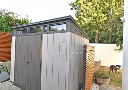 Der Garten ist mit mediterranen Pflanzen und Bäumen gestaltet und vollständig mit automatischer Bewässerung ausgestattet. Parkmöglichkeiten befinden sich innerhalb des Grundstücks auf gepflasterten Flächen, teilweise überdacht. Der Stauraum ist großzügig, mit einem Abstellraum im Haus und zwei weiteren Außenabstellräumen. Ein Kinderspielplatz sowie ein Whirlpool runden den Außenbereich ab.