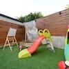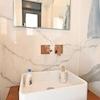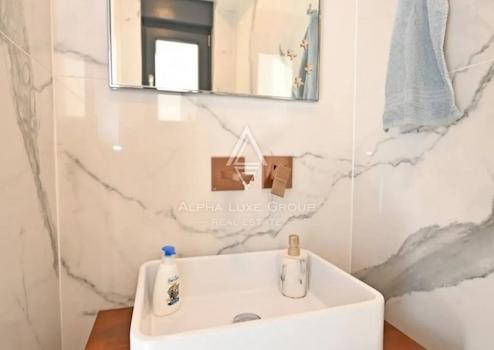 Der Grundriss ist funktional und lichtdurchflutet. Im Erdgeschoss befindet sich ein offener Wohnbereich, der mit Küche und Flur verbunden ist und direkten Zugang zu einer großzügigen Terrasse bietet, ideal für den Alltag und gesellige Stunden. Im Obergeschoss stehen zwei Schlafzimmer sowie ein Badezimmer zur Verfügung. Ein besonderes architektonisches Detail ist der ehemalige Balkon des Hauptschlafzimmers, der zu einem begehbaren Kleiderschrank mit Aluminiumrahmen und Glaswänden umgebaut wurde.