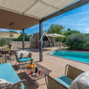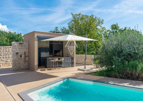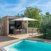 Der gepflegte Garten verfügt über eine perfekt integrierte überdachte Sommerküche, ideal für Mahlzeiten im Freien und geselliges Beisammensein. Ein Nebengebäude beherbergt ein Büro, ein Badezimmer und eine Waschküche, was zusätzlichen Komfort für Gäste oder Homeoffice bietet. Das Herzstück des Außenbereichs bildet der elegante Swimmingpool mit Sonnenterrasse, umgeben von mediterraner Bepflanzung, die den luxuriösen Charakter des Anwesens unterstreicht.