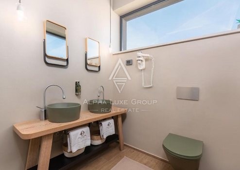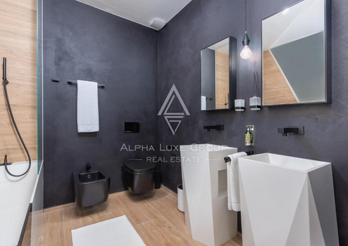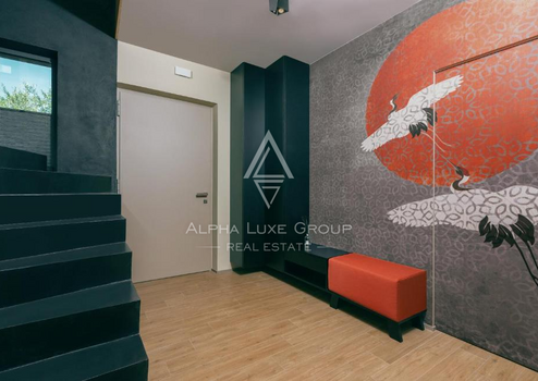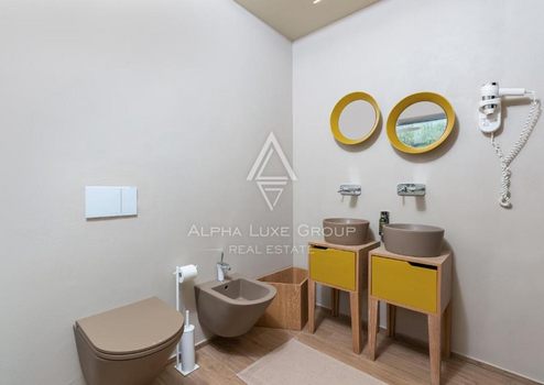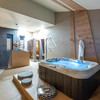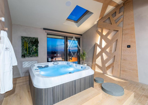 Das Obergeschoss umfasst eine private Wellnesszone mit Sauna und Whirlpool sowie zwei elegant gestaltete Schlafzimmer, die jeweils über ein eigenes Badezimmer verfügen. Diese Etage bietet eine entspannende Spa Atmosphäre und maximale Privatsphäre.